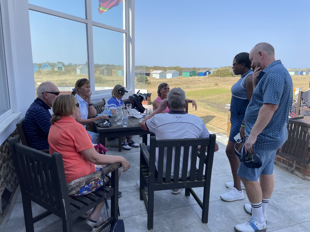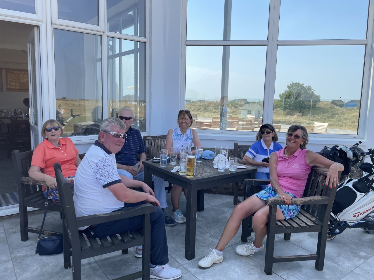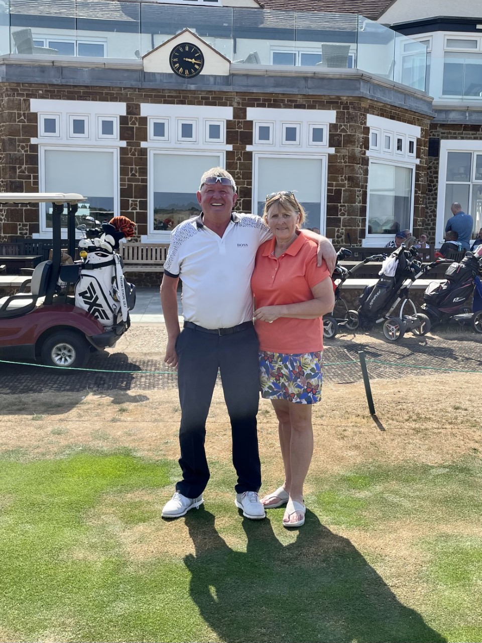The bravest battled on, consuming water like a leaking ship as the battle now become survival rather than the wonderful test of the Hunstanton links. Phil Luke returned, with his partner Mandy having retired only after a few holes, with a brilliant 37pts. His well earned first pint of lager didn’t touch the sides! Bryan & Pearl Powell one of only 2 couples to walk and complete their rounds, signed off with a wonderful 37pts. Willie & Helen Rae then matched this score that would turn out to be “the best of the day” in the very demanding conditions.