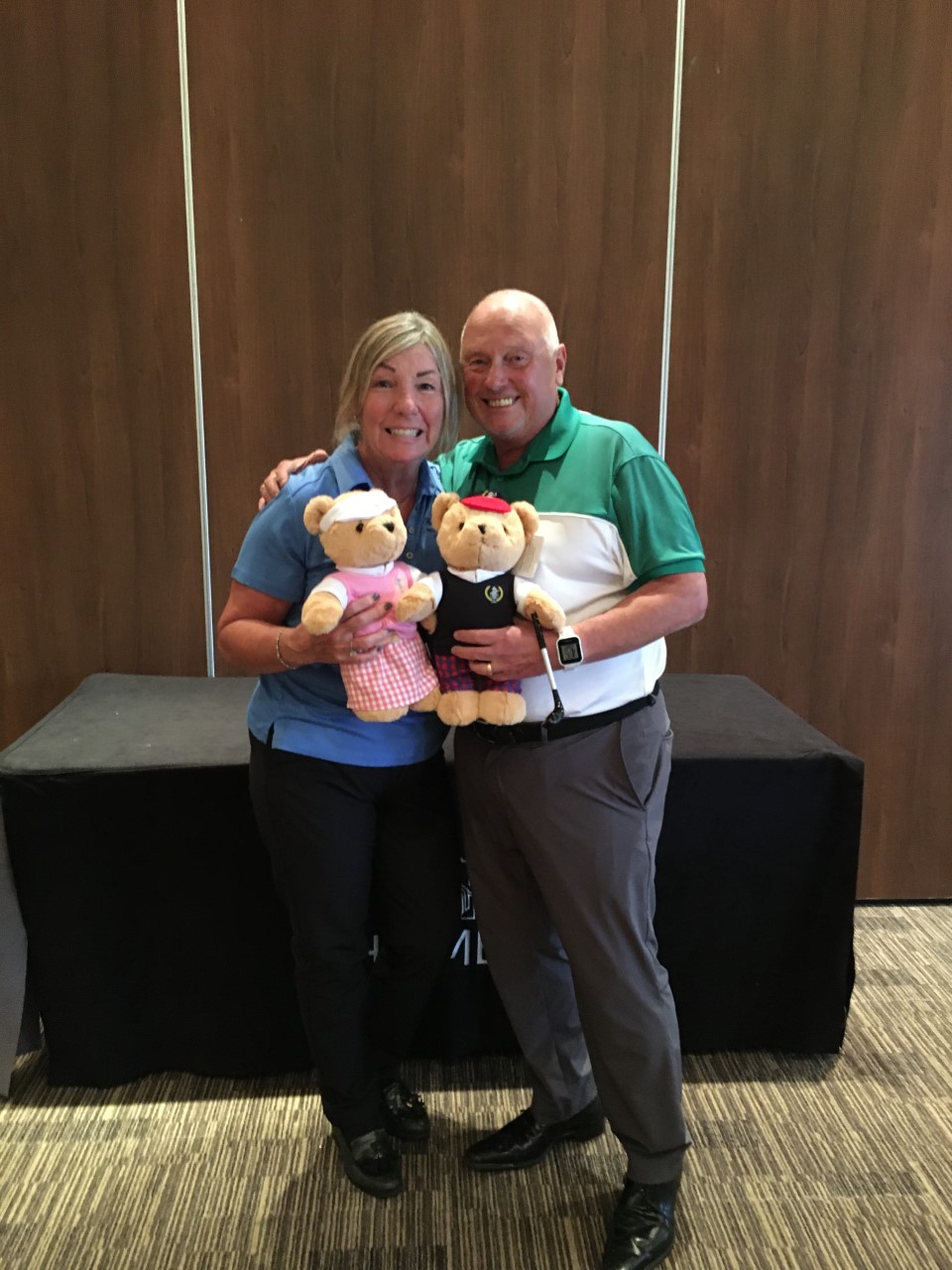 Day 2 again bought clear blue skies. Would it possible for us to go through the whole of our UK events without seeing any of the wet stuff! Alas not to be, for our final few groups the rain fell dampening the course but definitely not the spirits of all as they arrived to the warmth of the clubhouse. A fine score of 38pts by the low handicap duo of Peter Lockett & Teddy Bevan was eclipsed by Kevin & Judy Brown by a single shot. Then late in the day, having played through the worst of the weather, Stuart & Val Robinson produced a magnificent best of the day score of 40pts.